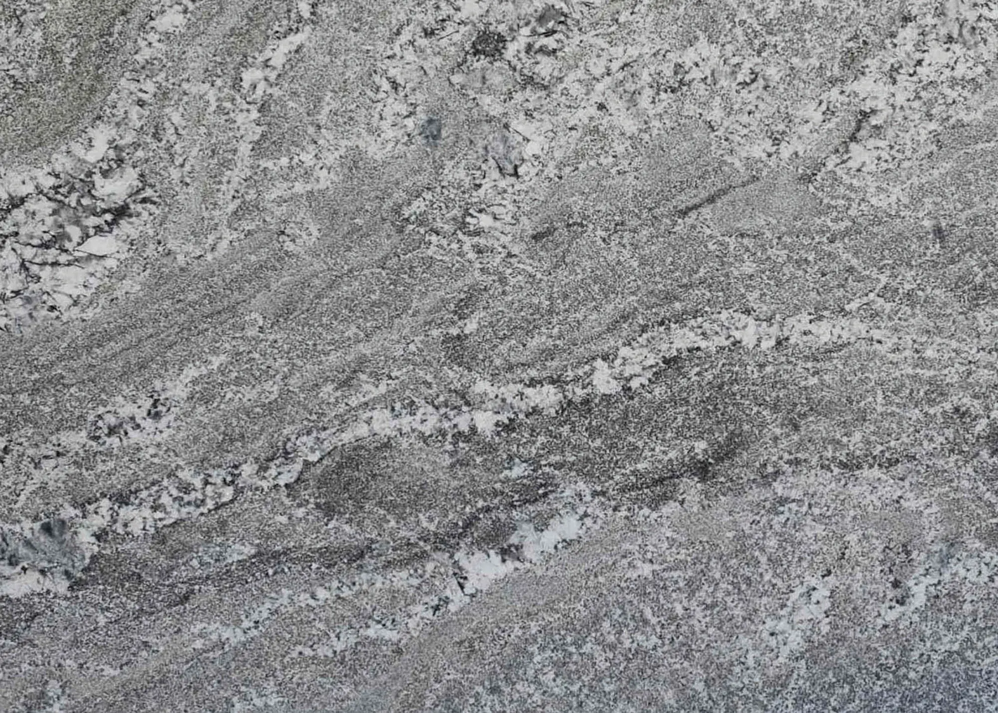Silver Falls granite countertops from India feature a mixture of light grays with medium- and dark-gray tones. The stunning natural stone slabs come with polished finishes and medium variations for counters that can be installed in traditional to contemporary kitchens, outdoor kitchens, and bathrooms for both residential and commercial use.